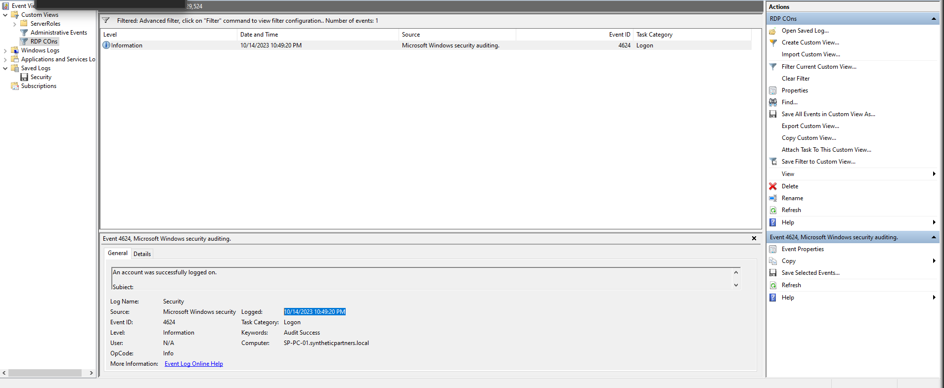 <Select Path="file://C:\Labs\Evidence\VirusVipers\TriageImages\2023-10-16T070418_Evidence-SP-PC-01\C\Windows\System32\winevt\logs\Security.evtx">*[System[(EventID=4624) and TimeCreated[@SystemTime>='2023-10-14T00:00:00.000Z' and @SystemTime<='2023-10-14T23:30:00.999Z']]] and *[EventData[Data[@Name='LogonType'] = '10']]</Select>