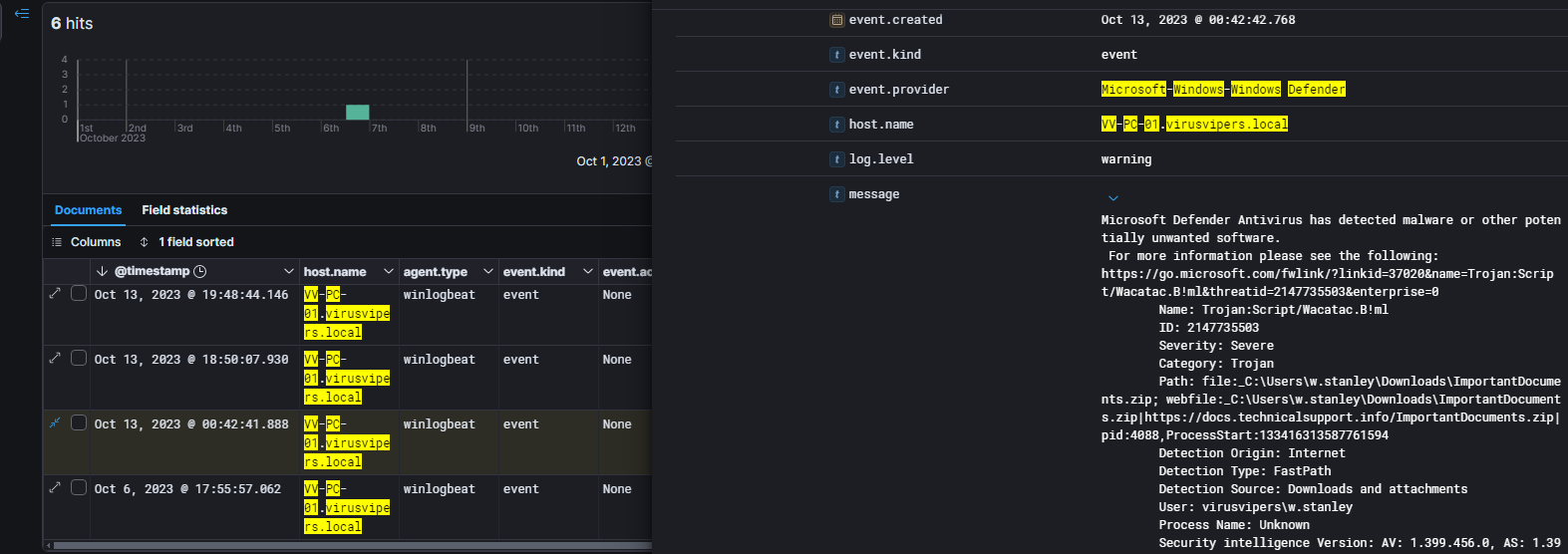 To begin, knowing that the machines have Microsoft Defender, I searched for all detections for the two Virus Viper machines.