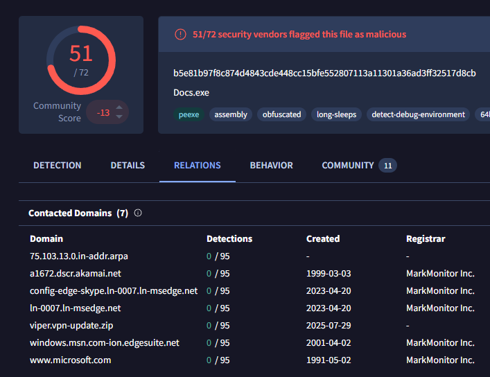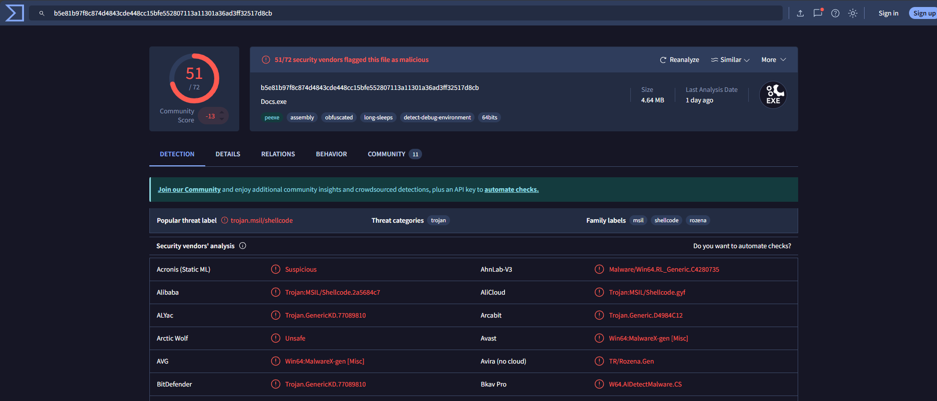 From what VirusTotal shows, we can therefore trace the file back to donut loader.