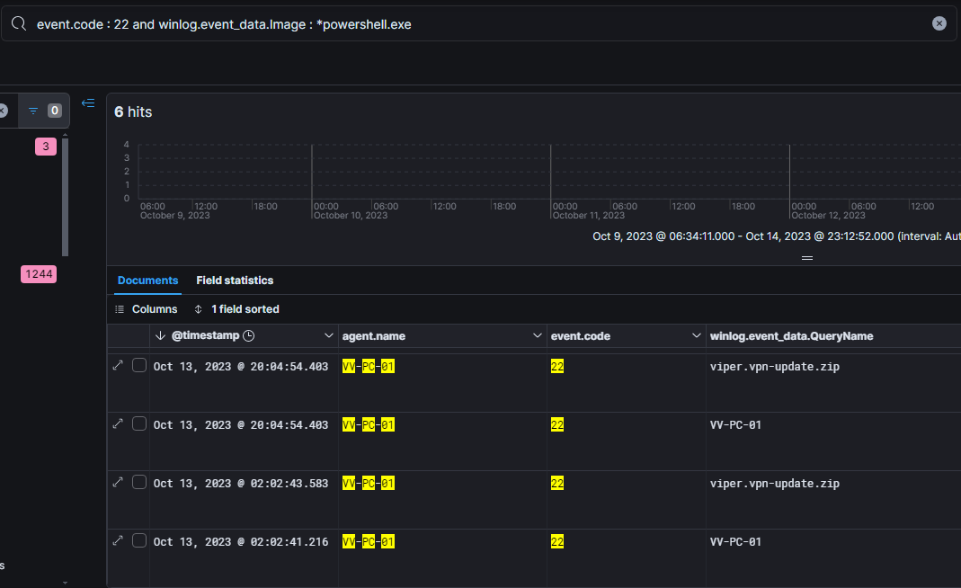 To find the answer to this question, we can look for event code 22 related to DNS request registrations and link them to powershell.exe processes: